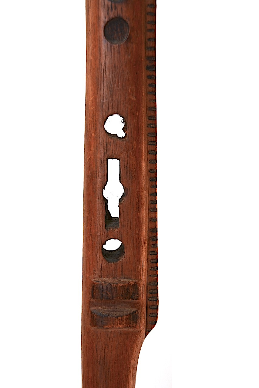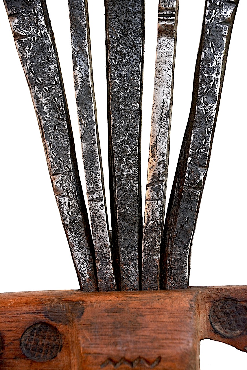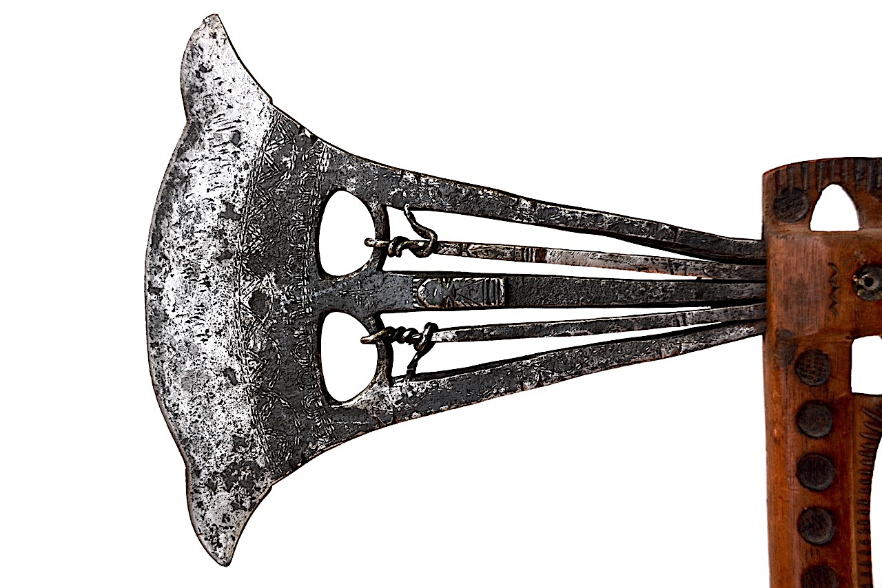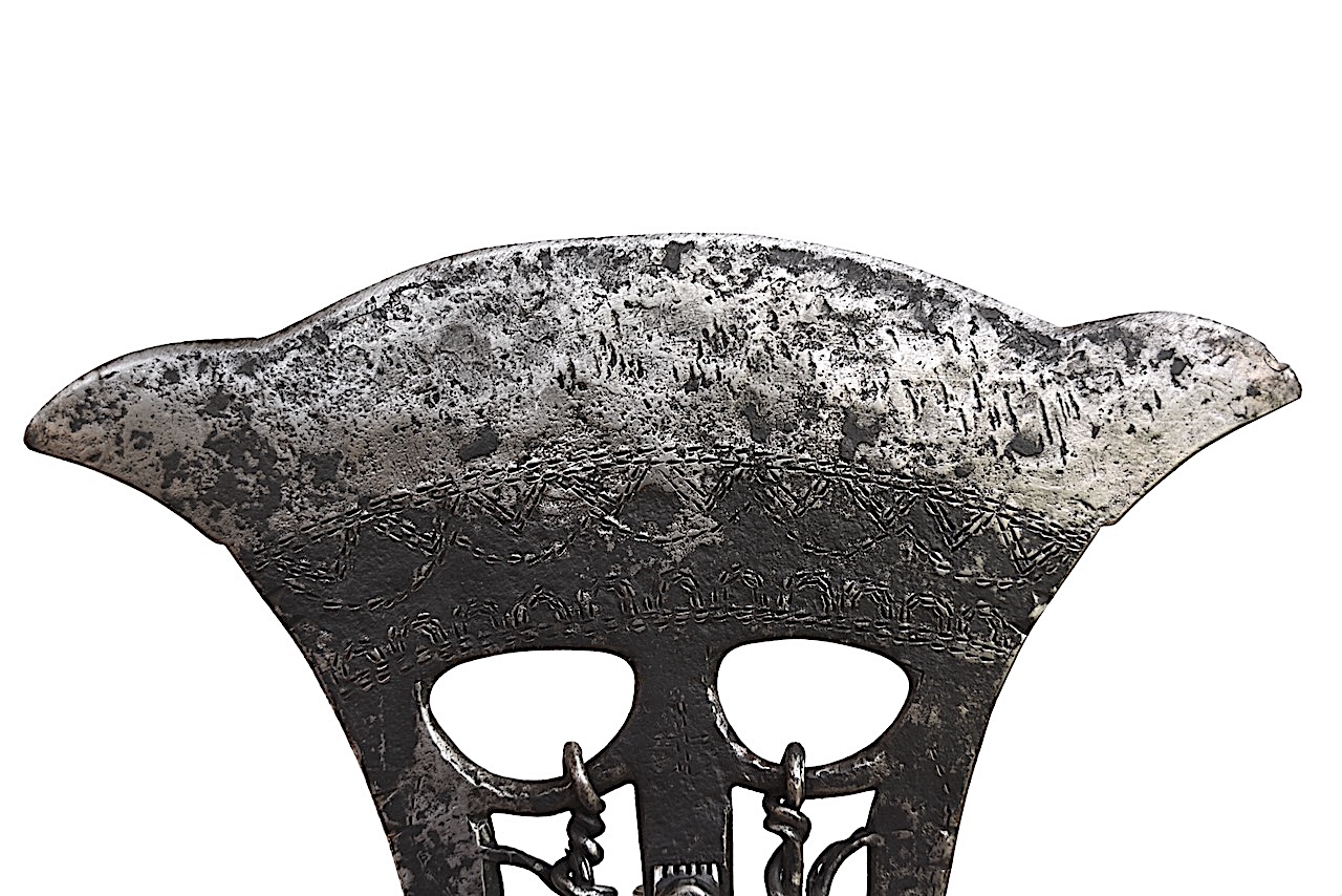 Très beau travail d’ingéniosité, une tête plate kifwébé est rapportée au centre de la lame sur la branche large du milieu, tout ceci sur les deux faces.