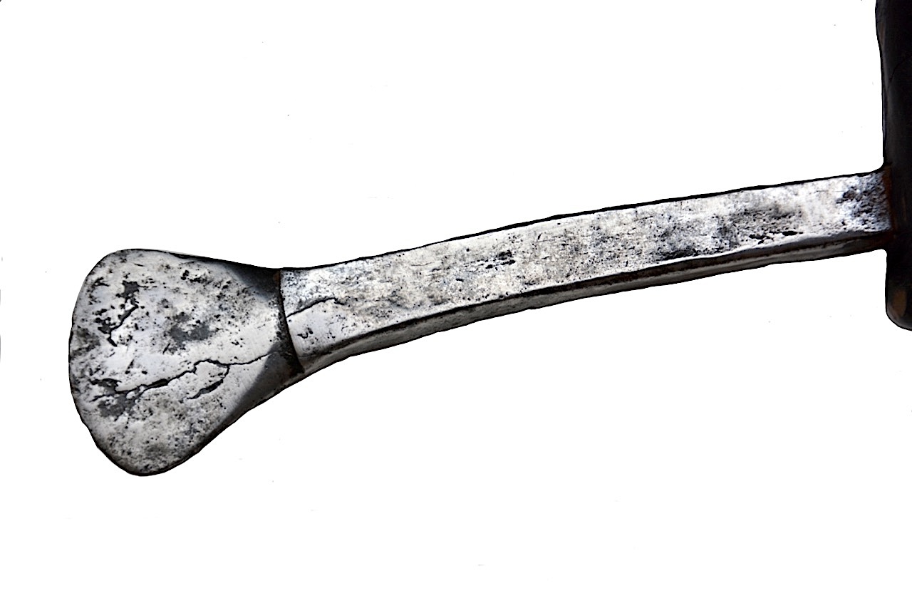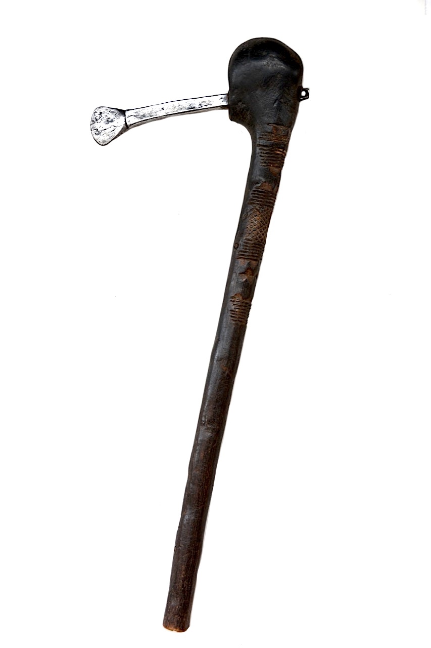 Hache à long manche, le fer est très épais, de section rectangulaire s’affinant au fur et à mesure qu’il entre et traverse la tête du manche en dépassant derrière, où le bout est perforé.