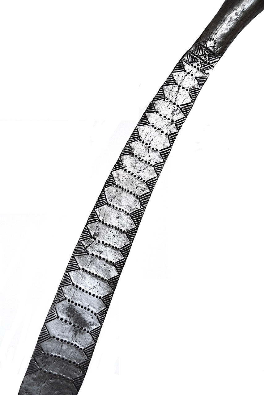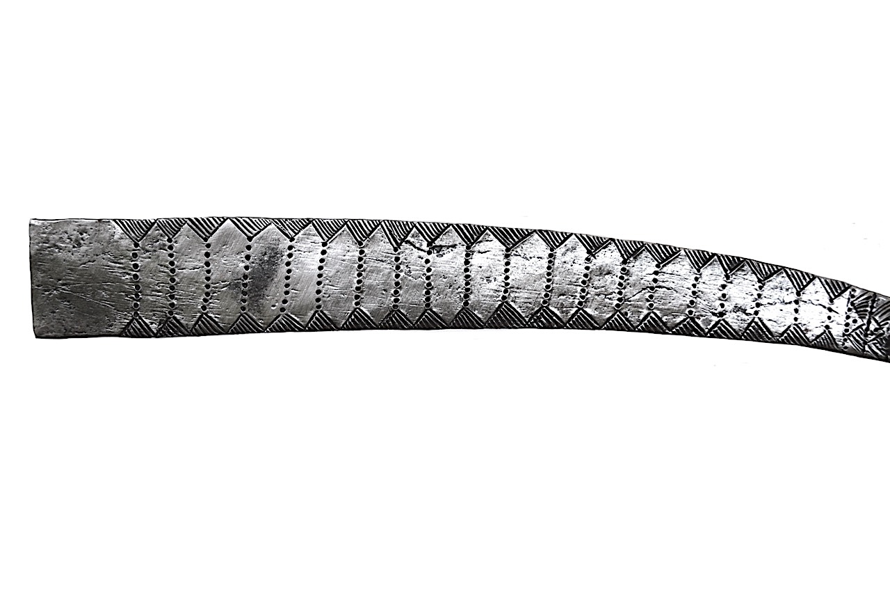 La lame est courbe, la partie plate est couverte de décors ciselés.