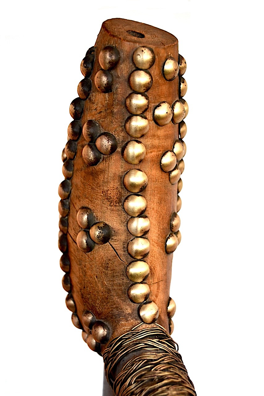 Cette partie bulbeuse cylindrique est ornée de quatre rangées de clous en laiton dits « de tapissier ».