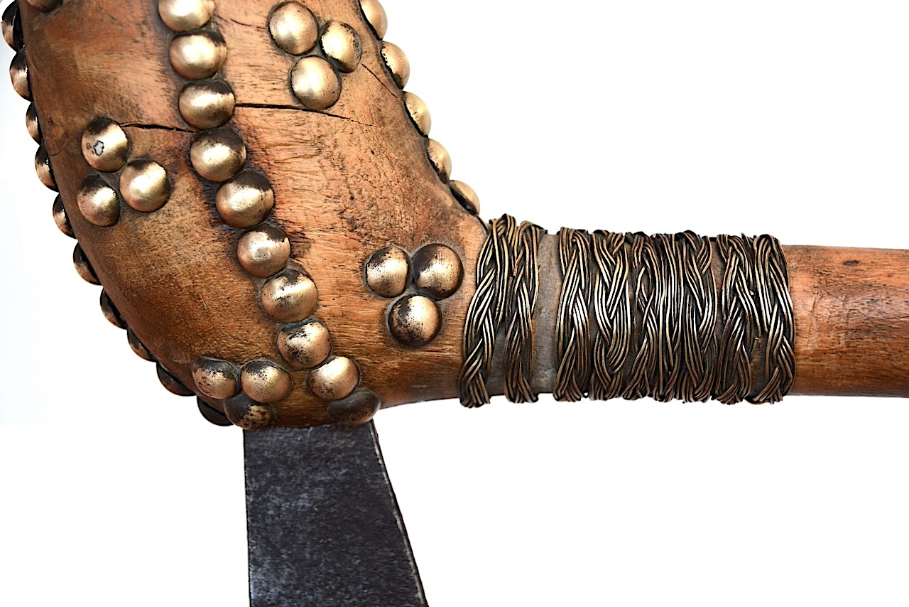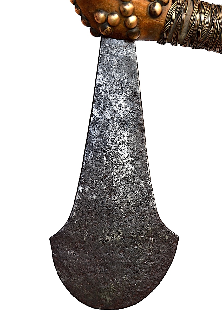 La pointe de la base de la lame entre dans la tête du manche de grosse taille, cylindrique à diminution conique et légèrement galbée.