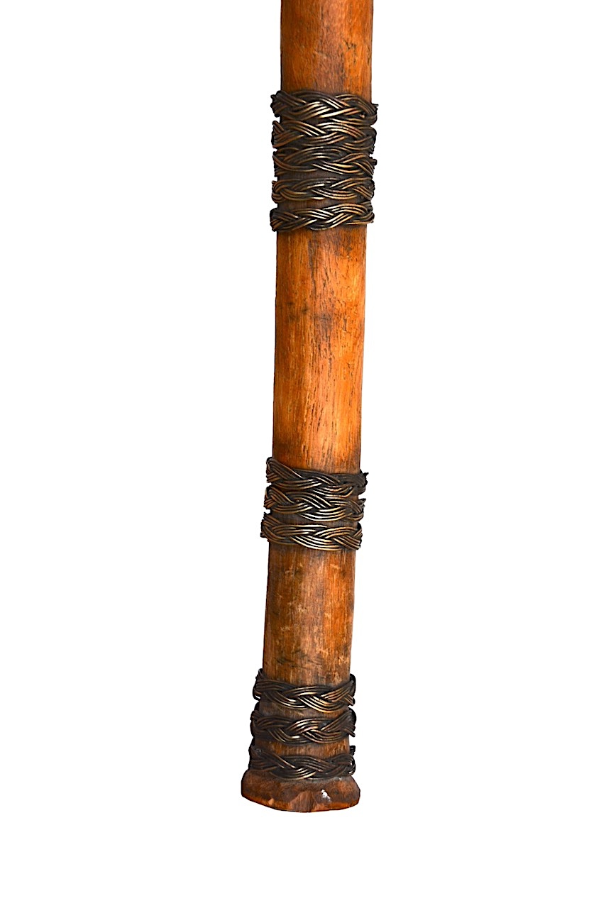 Le corps du manche cylindrique en bois clair, descend pratiquement à l’équerre sur une grande longueur (90 cm).