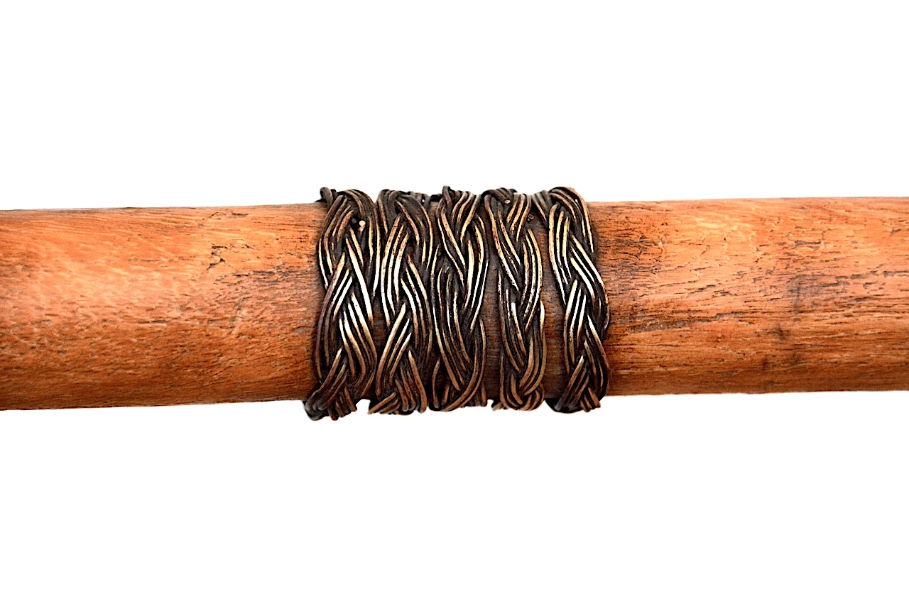 Ce corps est habillée par portions de frises de fils de laitons tressés en nœuds croisés, rassemblés par groupes et répartis sur la longueur.