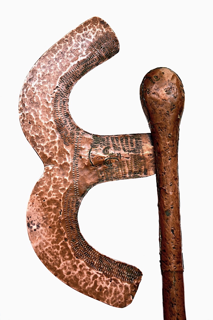 Cette hache nommée kilonda possède une lame pleine à deux grande ailes courbes extérieures formant une lame bifide large et très ouverte.