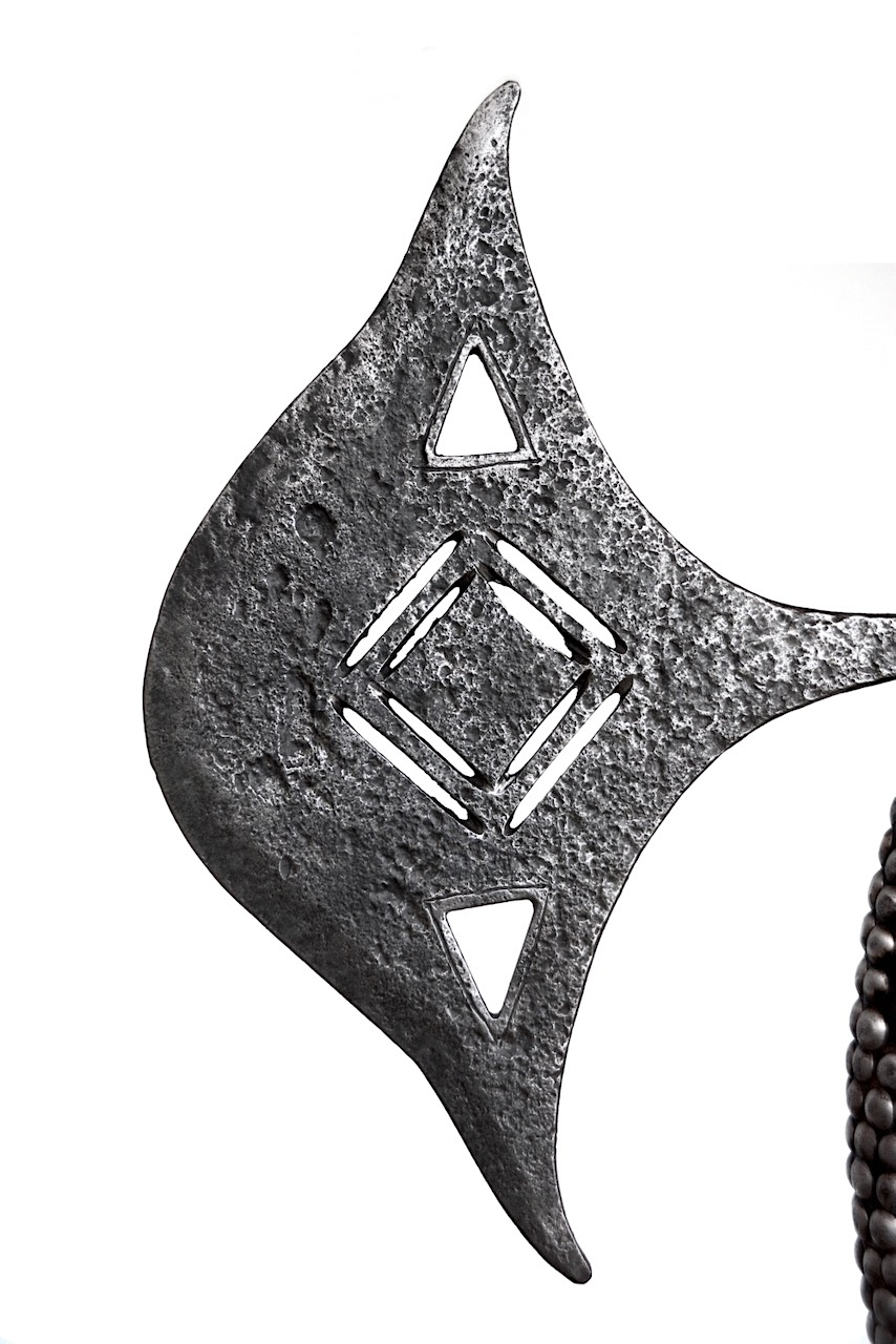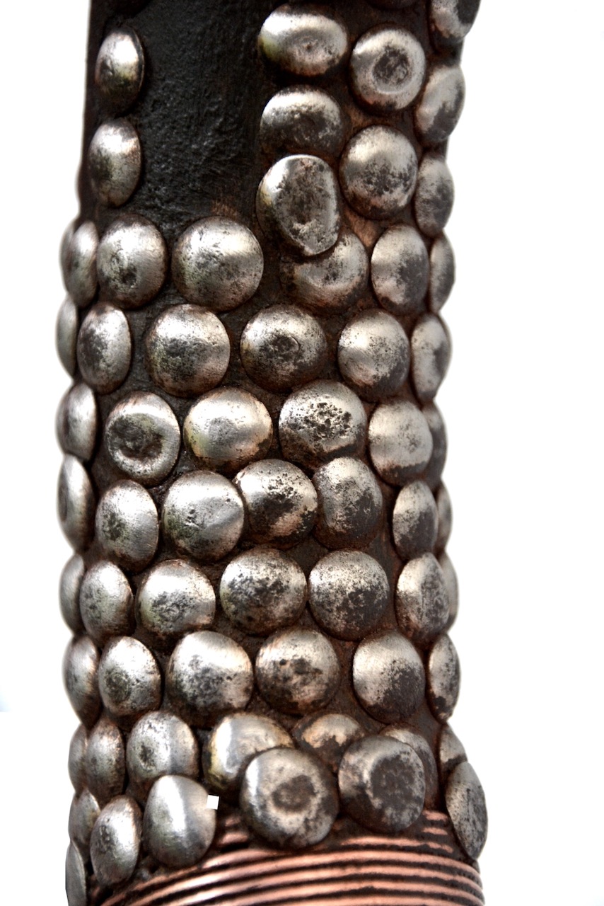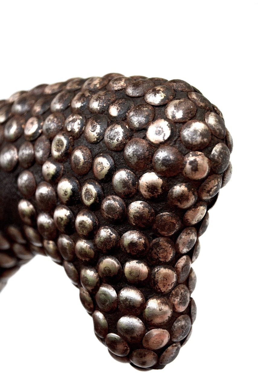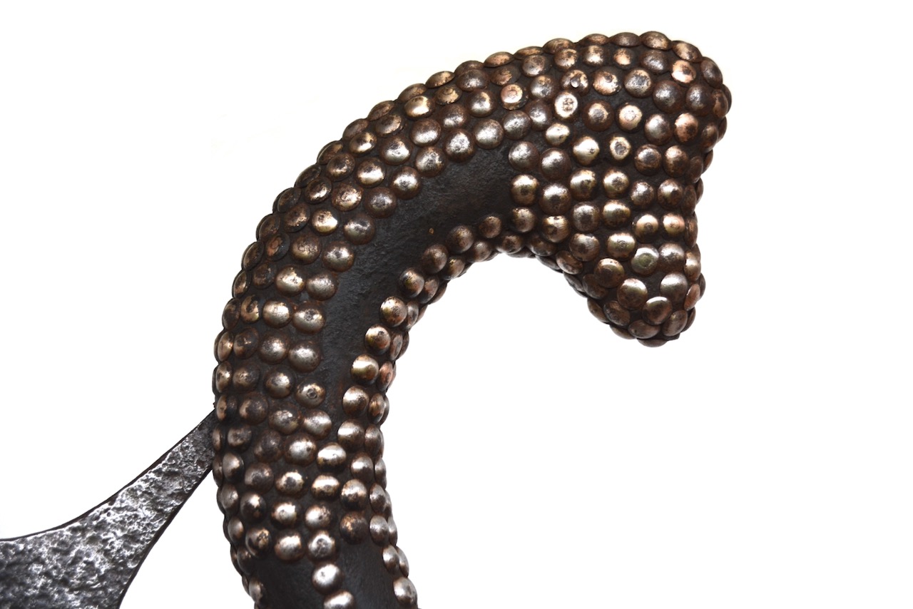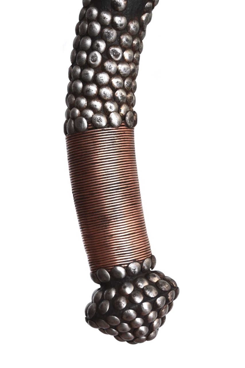 Le manche est recouvert de clous anciens en fer plus ou moins en ligne avec quelques vides savamment laissés et symétriques.