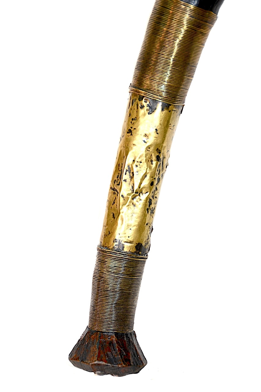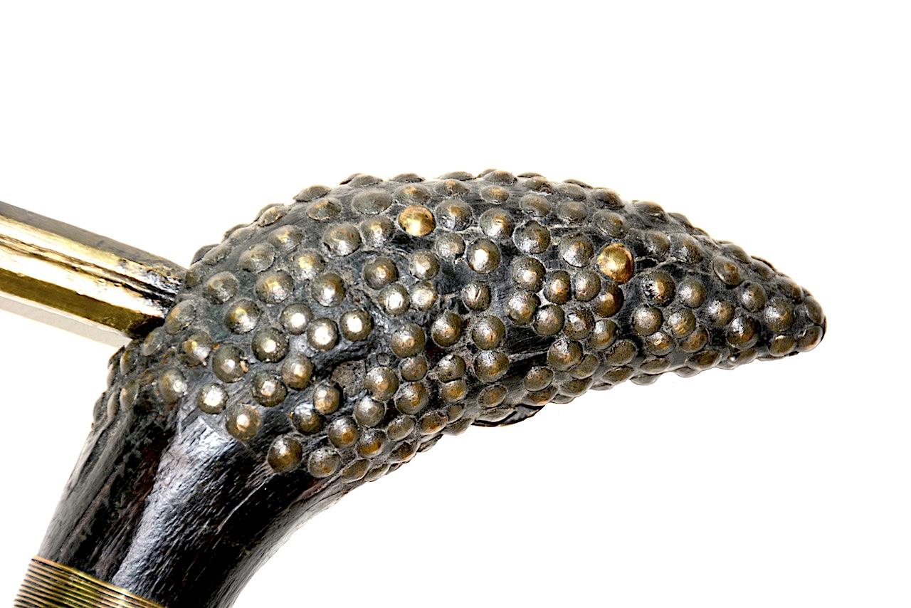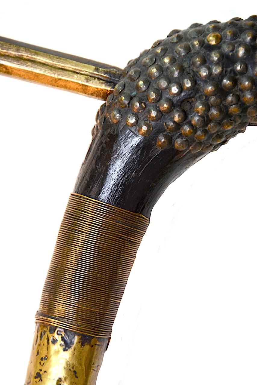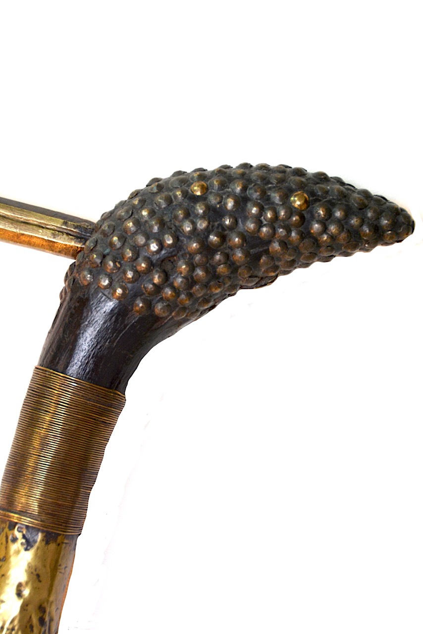 Le haut du manche comprenant la tête est ornée de clous de tapissier de plusieurs petites tailles en lignes remontantes serrées les unes contres les autres, recouvrant toute la surface.