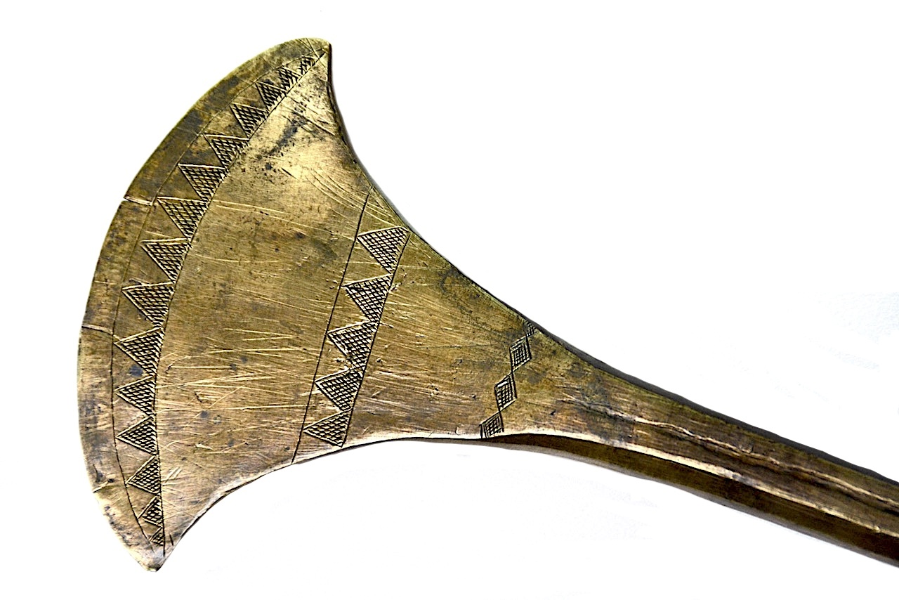 La lame en laiton est ciselée d’une frise arquée, suivant la courbe du tranchant et d’une frise verticale, les deux étant décorées de triangles hachurés en lignes croisées.