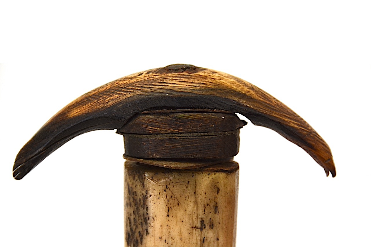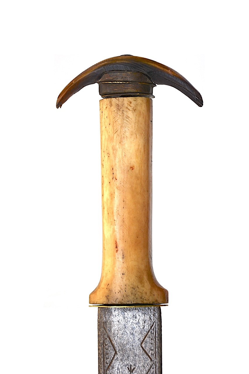 La soie traverse une poignée à étranglement long en os de dromadaire, superposée de deux rondelles en laiton alternées avec des rondelles épaisses en corne de bovin, le tout couronné d’une partie arquée à pointes extérieures en corne également.