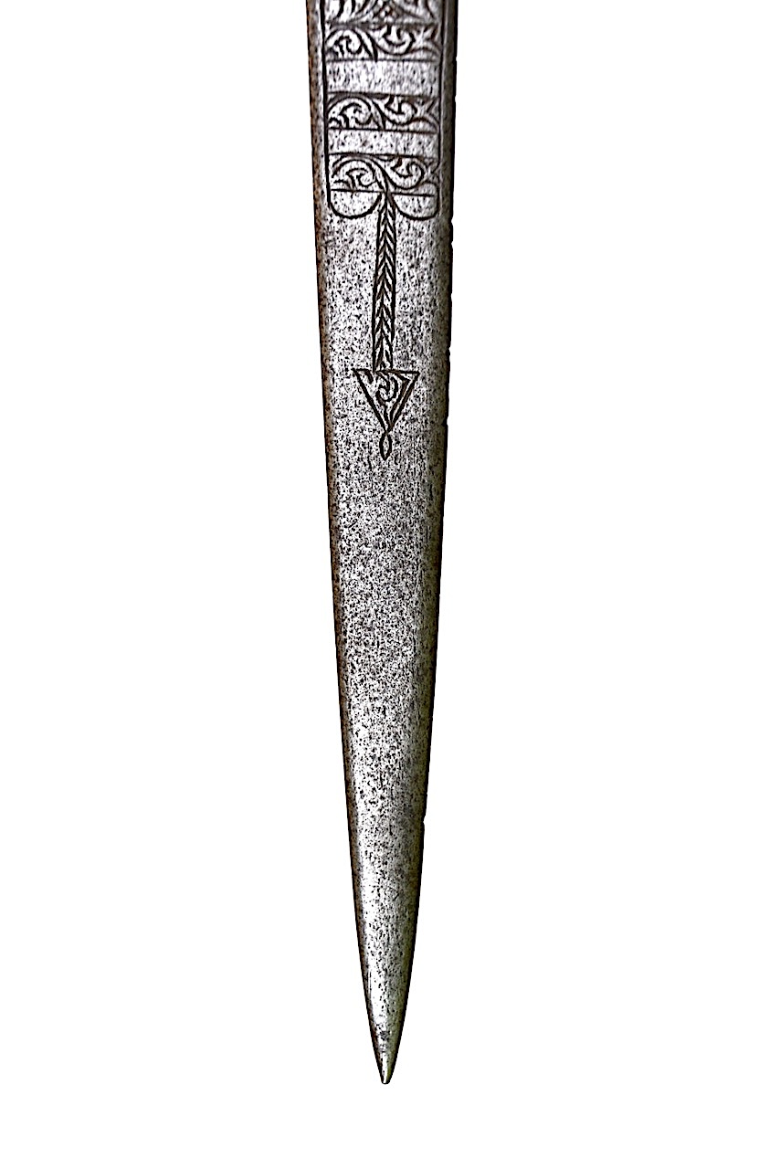 La lame est parallèle sur les trois quarts de sa longueur et se termine en pointe sur le dernier quart, le fil de lame n’est pas très affûté.