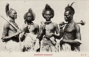 Guerriers Shilluk avec leurs casse-têtes. Soudan.