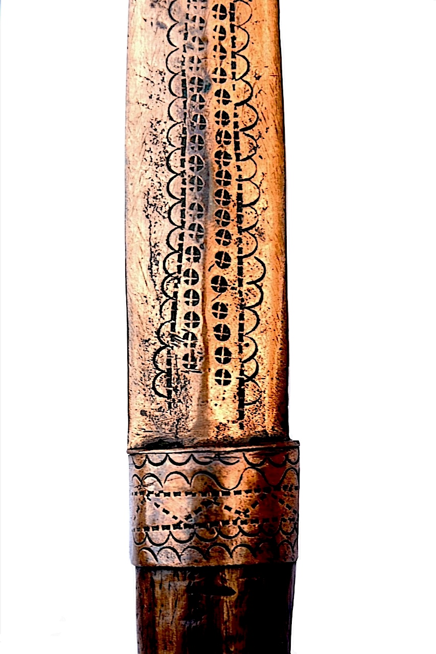 Cette lame est très épaisse sur son axe central, le décor ciselé est dans le même style que le couteau précédent.