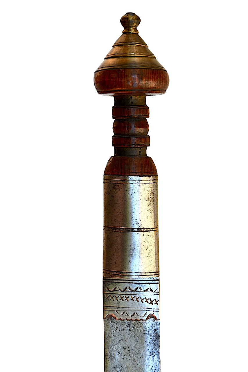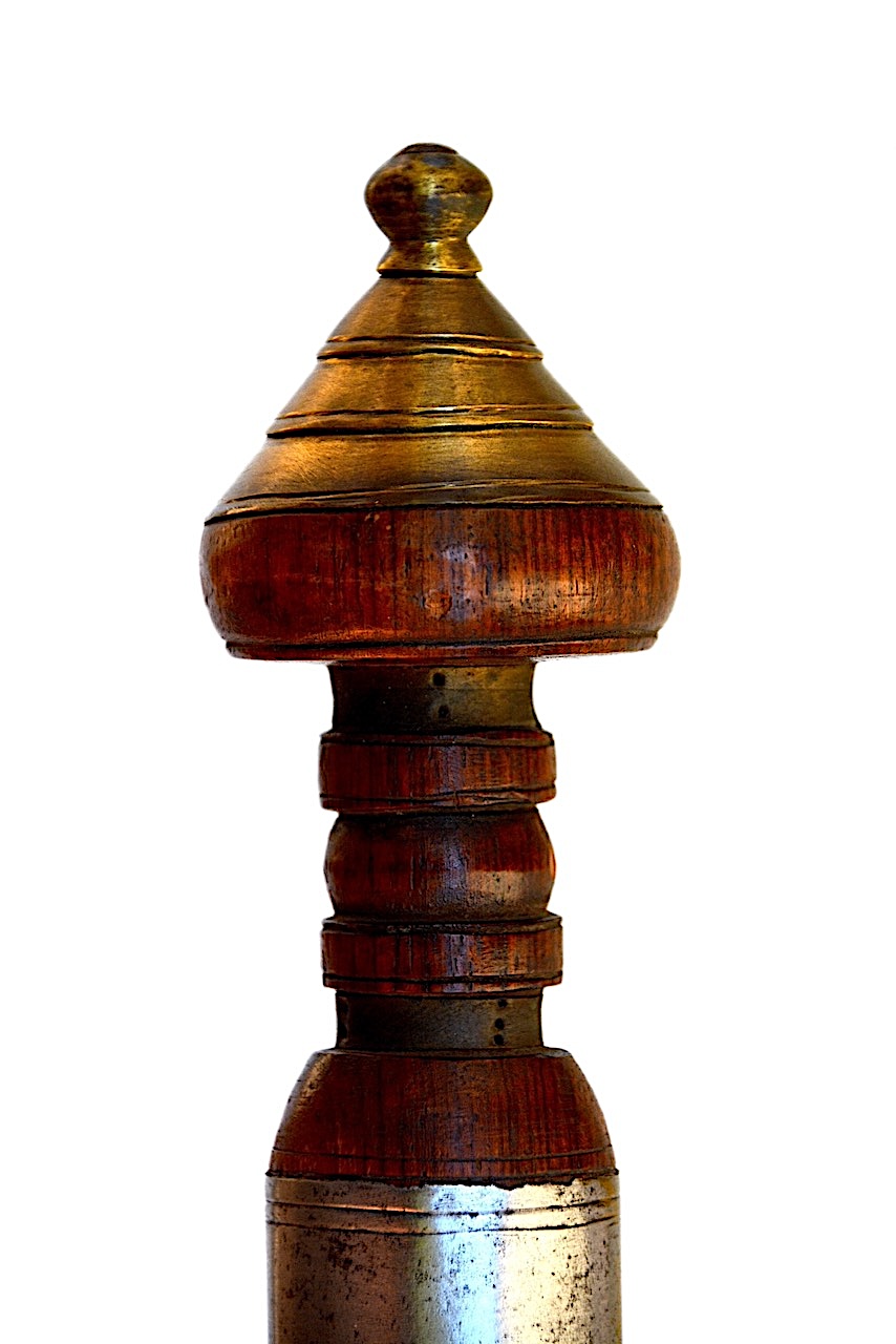 La poignée est en bois de section ovale au départ puis en étages d’anneaux épaulés et rainures surmontés d’une tête conique à escaliers.