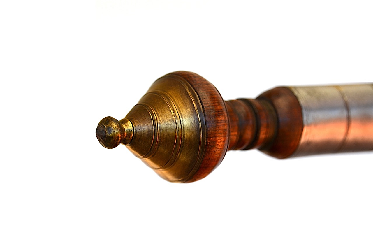 Le haut en cônes étagés est couvert de laiton épousant parfaitement la forme et se termine par un tenon en laiton également.