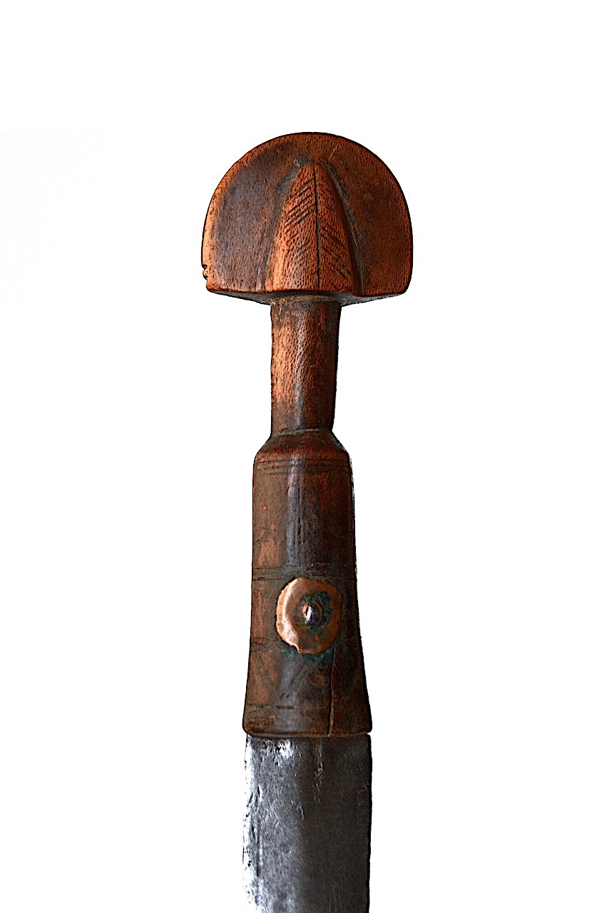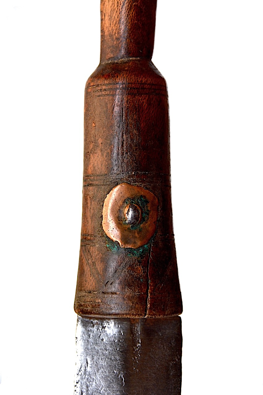 Cette partie basse est traversée par une pointe en fer au travers d’une pièce ronde en cuivre, la lame, et l’autre rondelle de cuivre de l’autre côté. Cette tige est sertie des deux côtés sur les rondelles de cuivre et stabilise la lame.