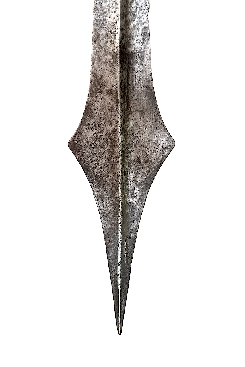 Cette lame de bonne largeur côté chape nous présente un long étranglement symétrique du corps pour finir sur sur bel évasement extérieur plus large que sa base et une superbe pointe en galbe long intérieur.