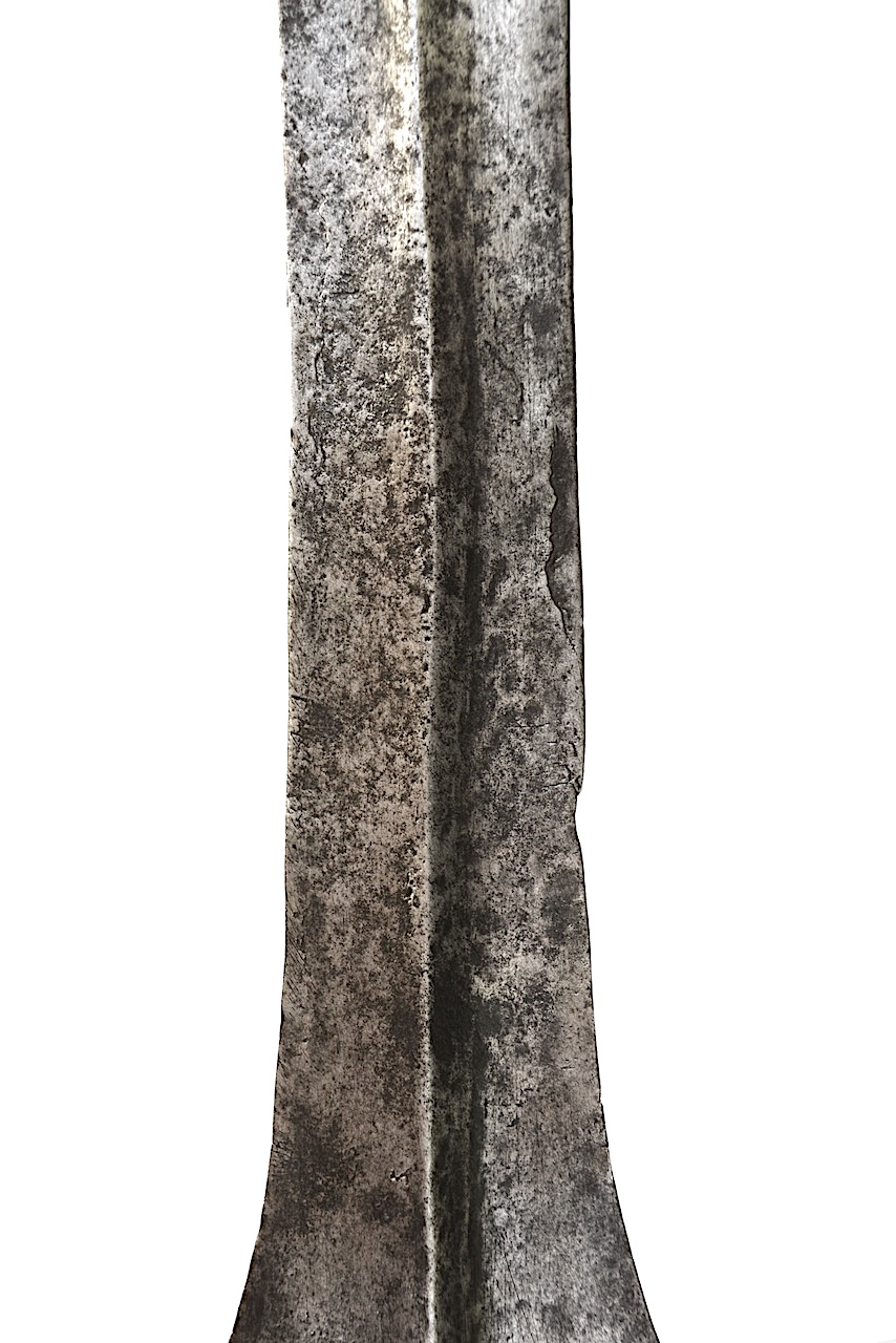 Voici une belle lame assez usagée avec un beau renfort central à épaulement, raidissant efficacement cette lame.