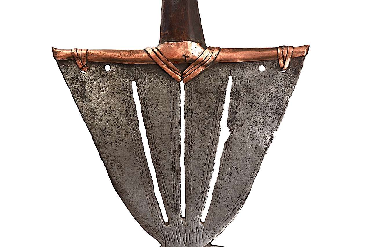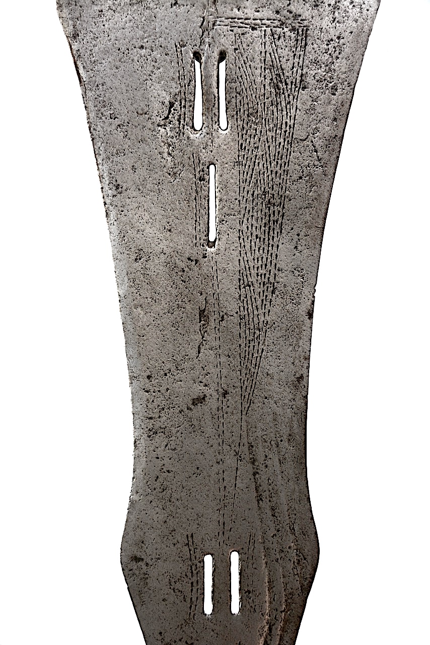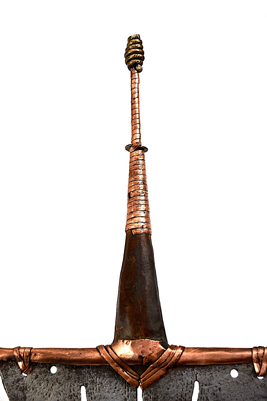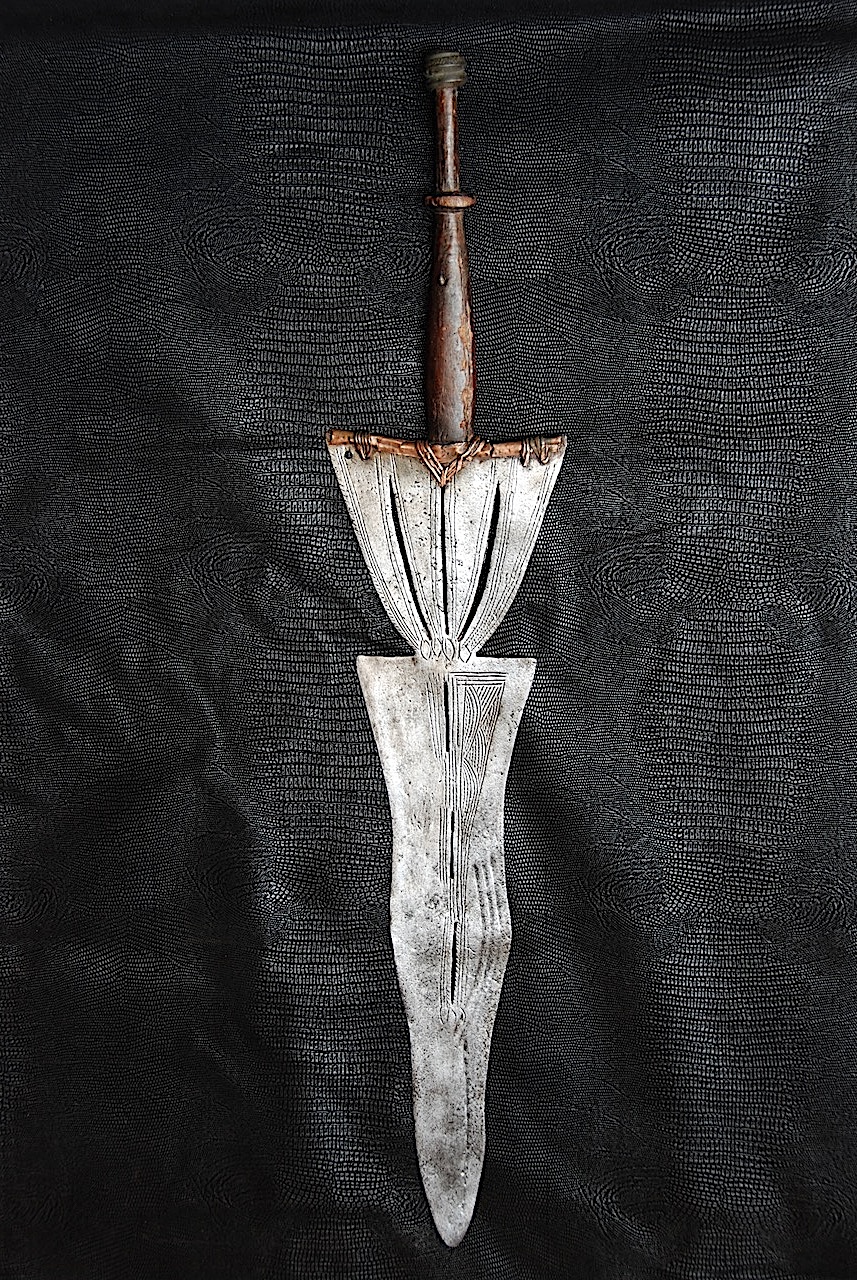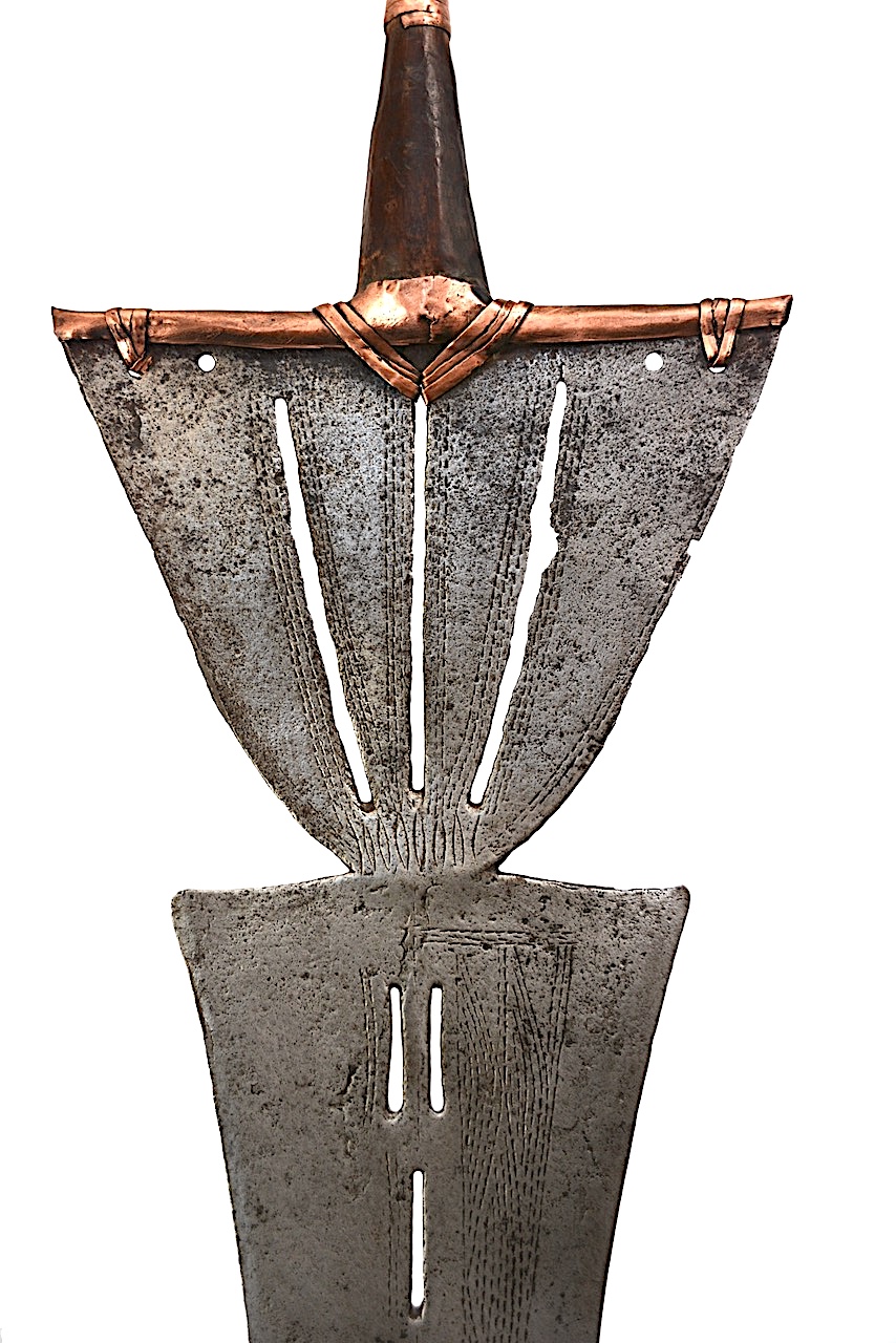 Cette épée à lame assez fine, d’une très belle forme, est très certainement une arme ou un emblème de chef.