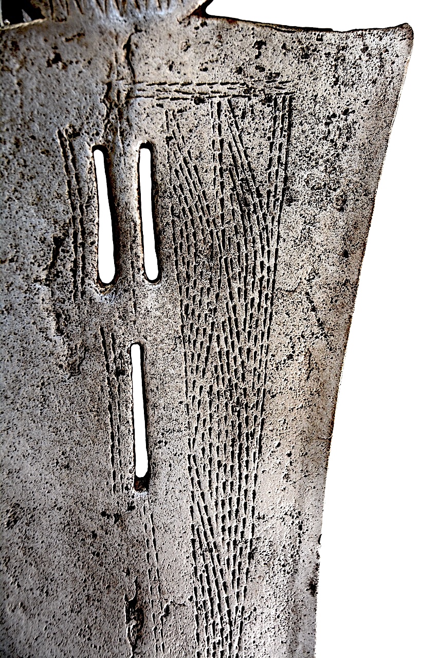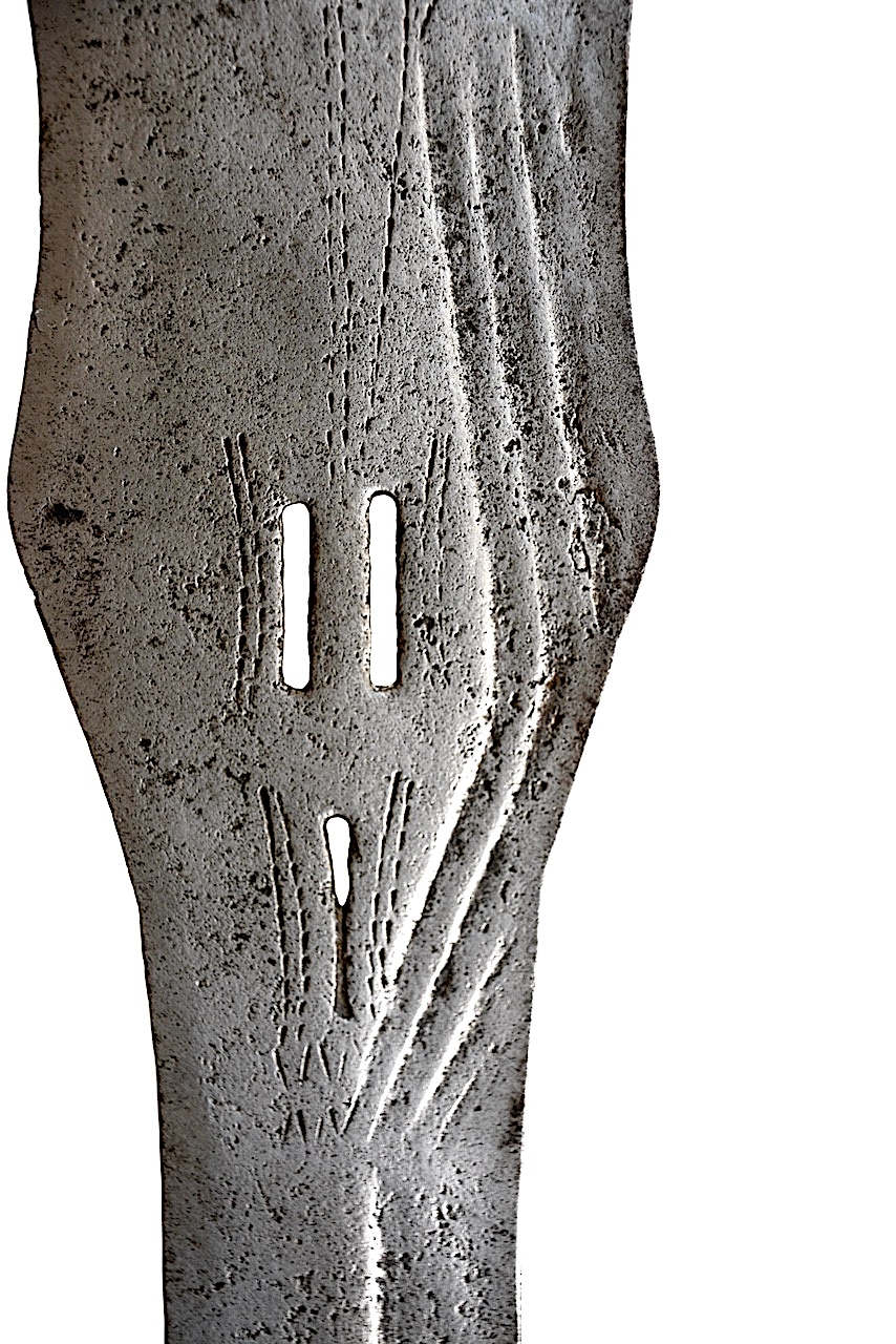 Sur la première partie de la seconde lame, le côté droit est ciselé d’un cartouche triangulaire long et rempli de lignes courbes, de tirets parallèles entres-eux.