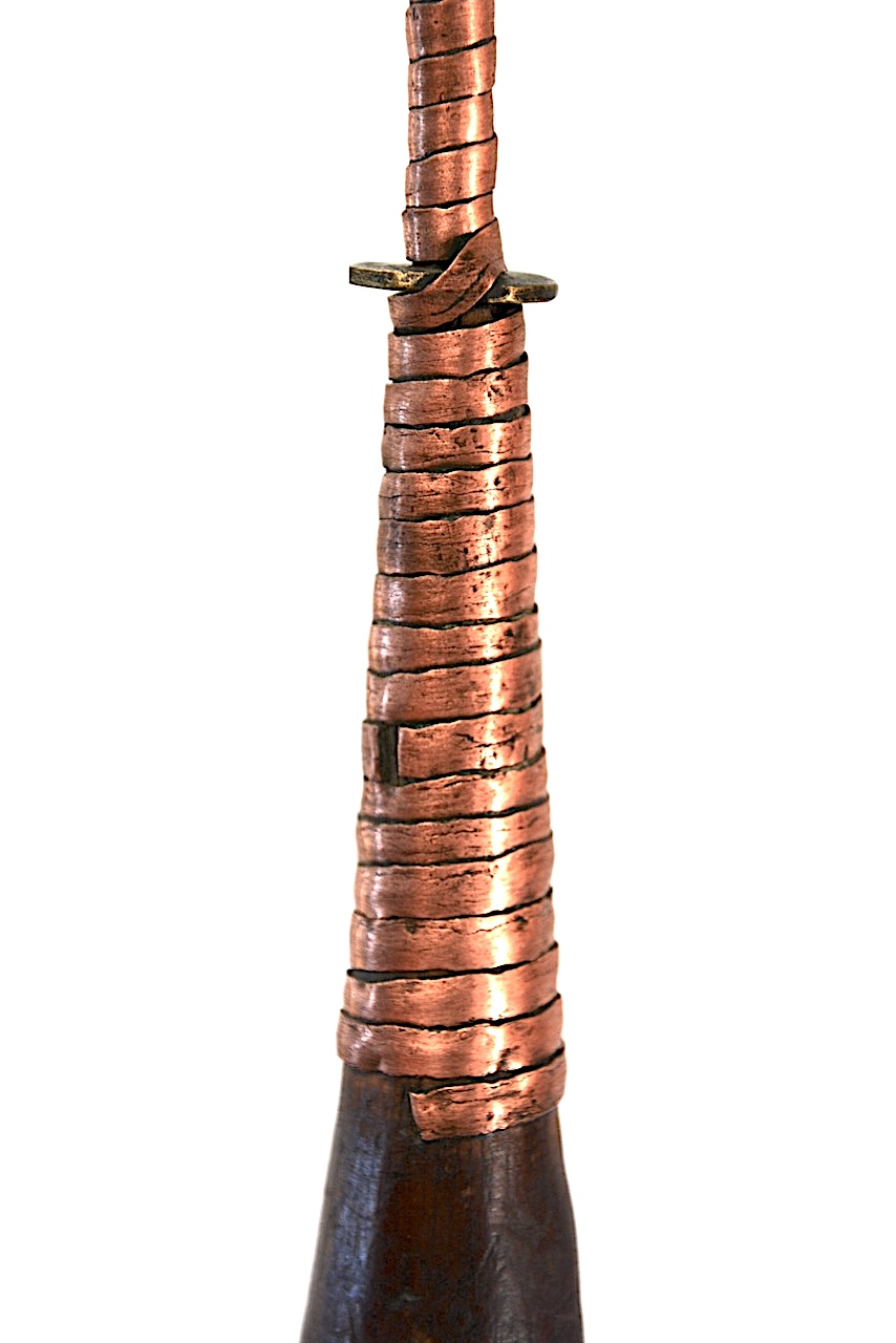 Le haut du cône en bois supporte un enroulement de cuivre assez large arrêté par une rondelle de cuivre.