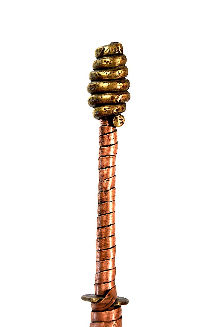 Au dessus, la soie débordante de dix centimètres environ est également habillée de cuivre enroulé et le haut en terminal se termine par un enroulement en amande de fils en laiton cylindrique assez gros.