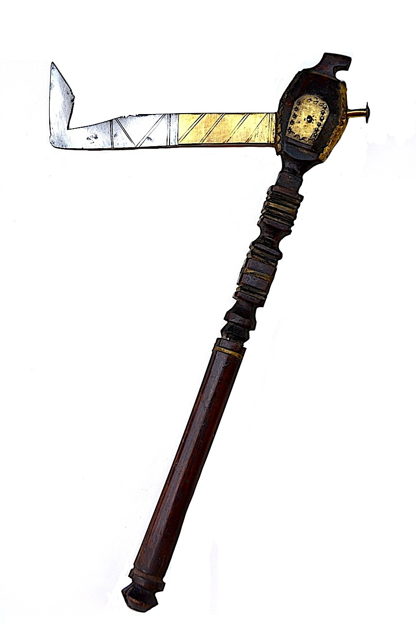 Cette petite hache de prestige possède une forme de lame assez atypique qui traverse le bulbe d’un manche en bois sous un angle fermé, inférieur à  45°.