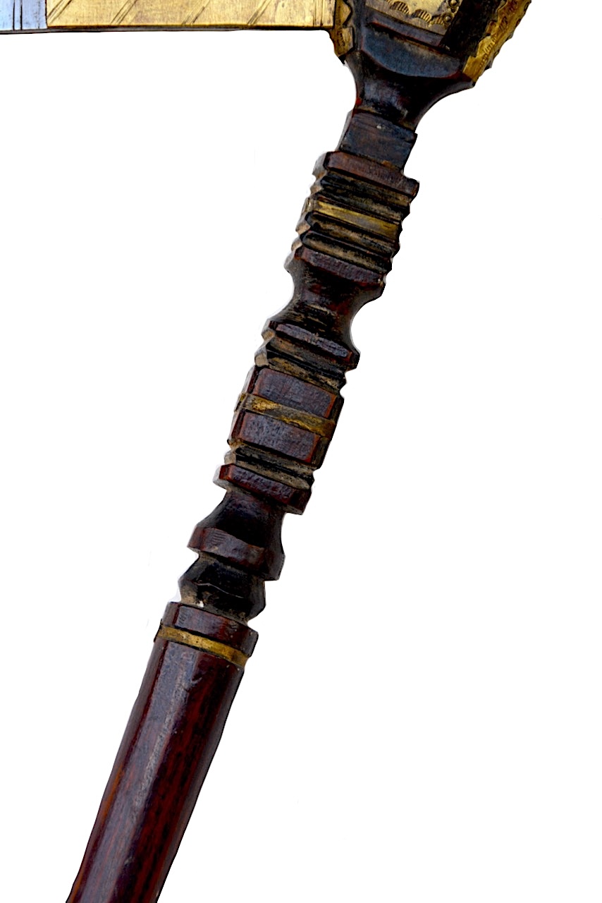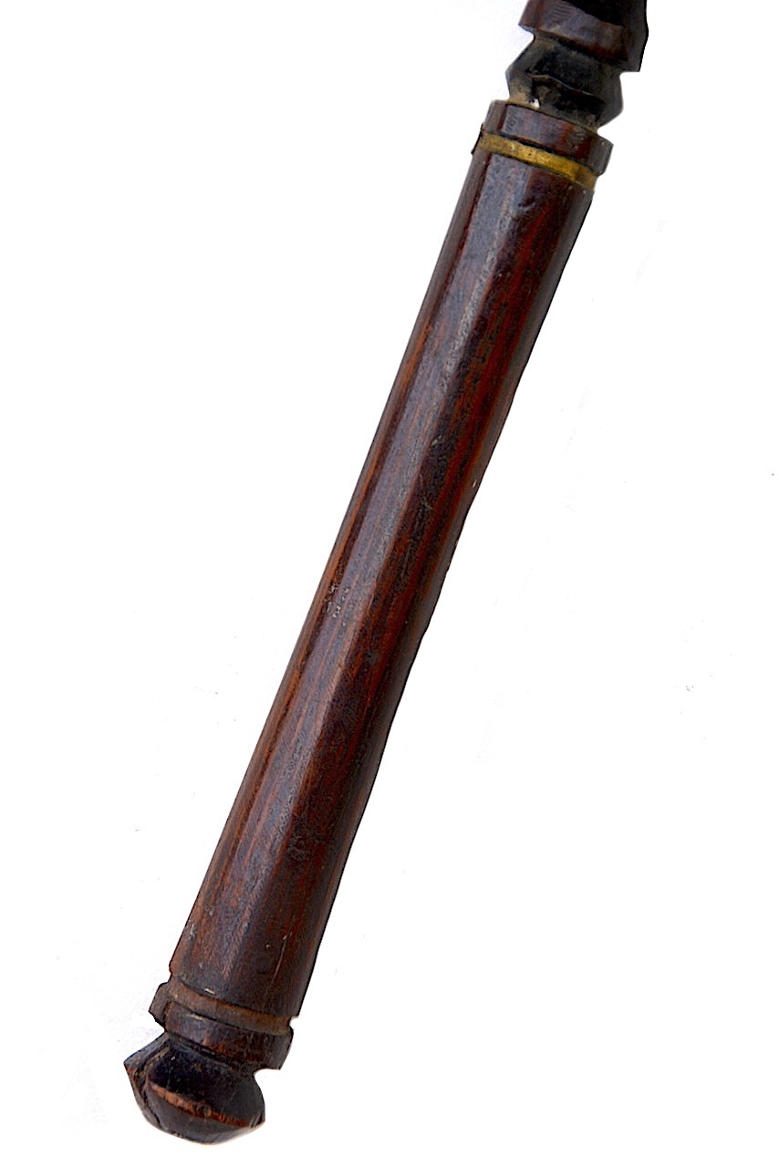 Le manche est en bois à corps bas cylindrique terminé par une rainure circulaire et un bout en forme toupie en doubles cônes inversés.