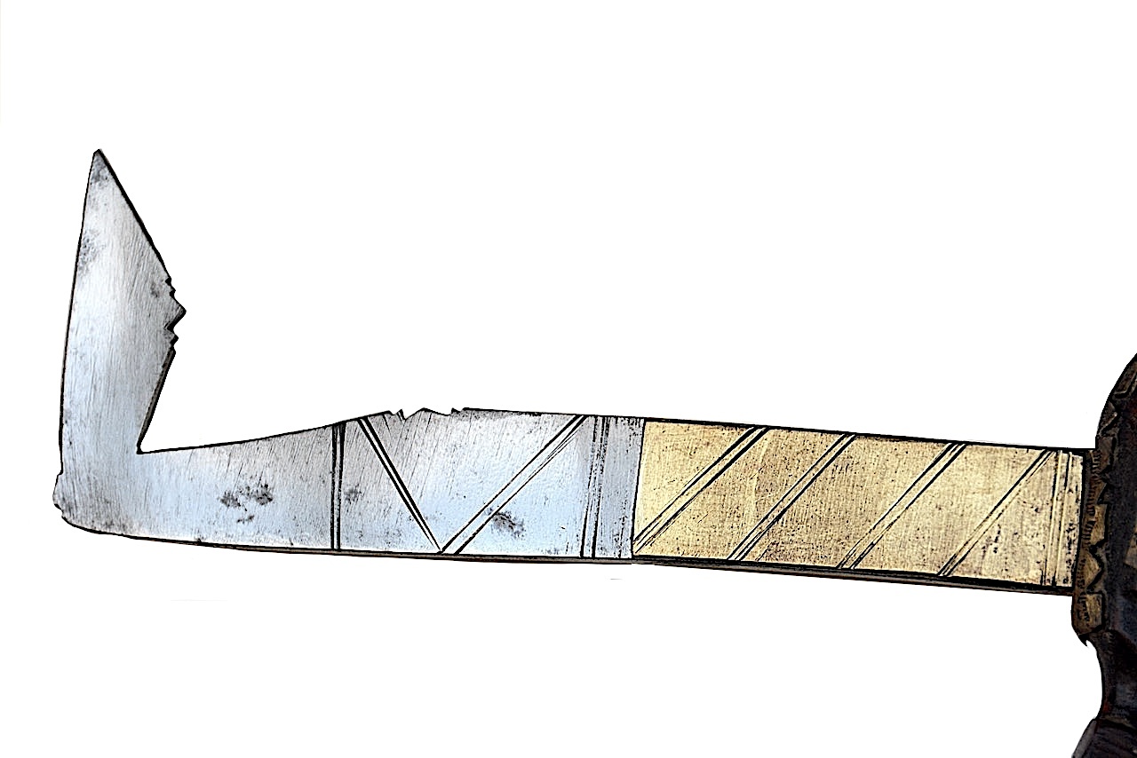 Cette lame de forme rectangulaire, côté soie, est couverte d’une longue plaque de laiton ciselée de doubles lignes en travers et de chaque côté.