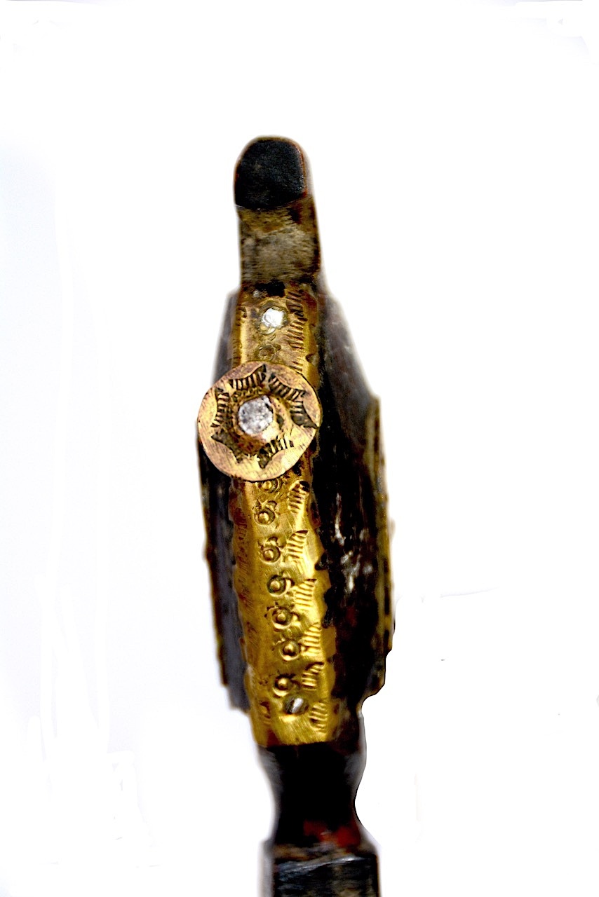 Les flancs du bulbe sont plaqués de feuilles de laiton en symétries, ciselées d’ empreintes en forme de croissants et de points en relief entourés de minuscules flashs.